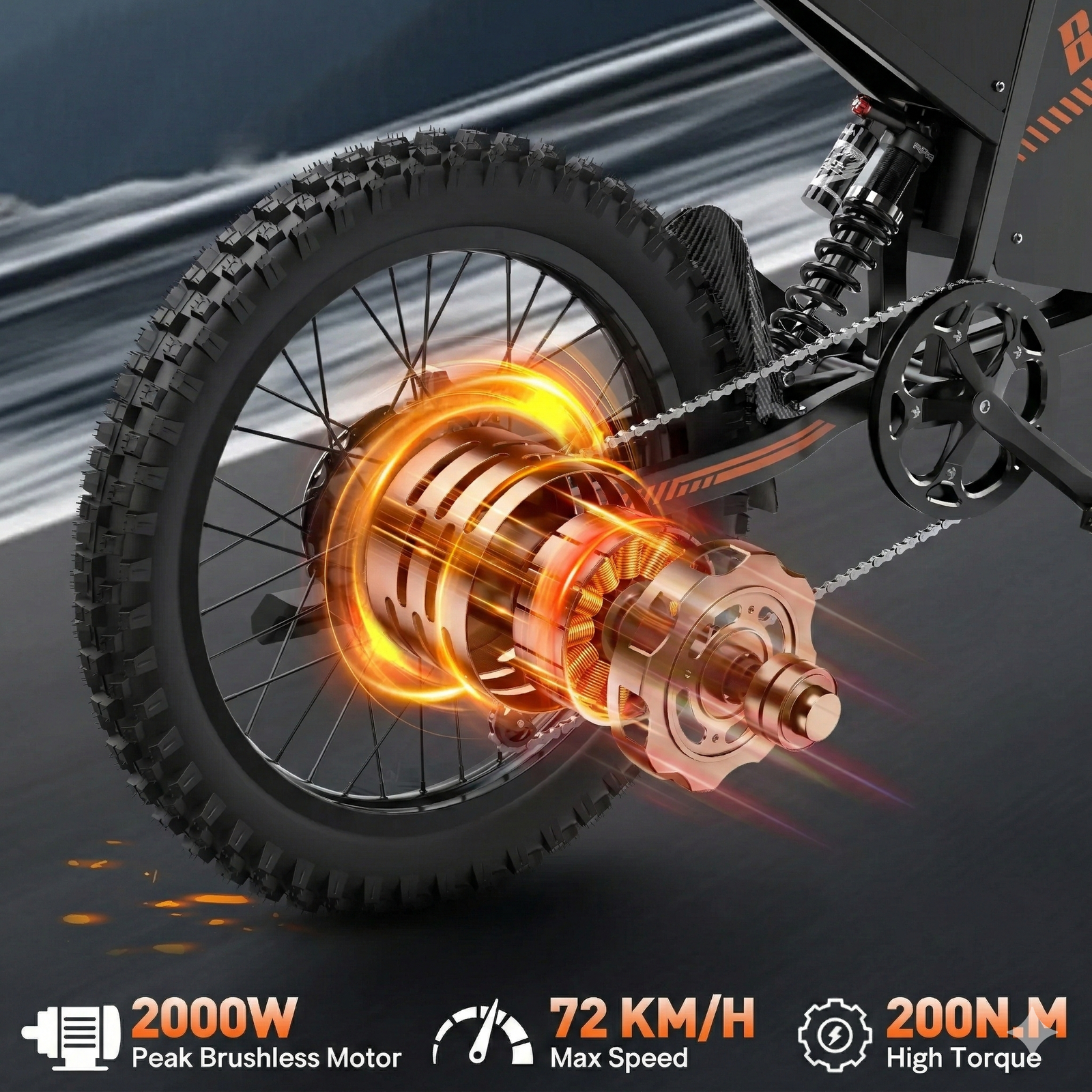 Hochgeschwindigkeits-Bürstenlosmotor: Ein robuster 60V-Motor liefert sofortiges Drehmoment und stabile Leistung, wodurch steile Anstiege und unwegsames Gelände mühelos bewältigt werden, ohne an Schwung zu verlieren.